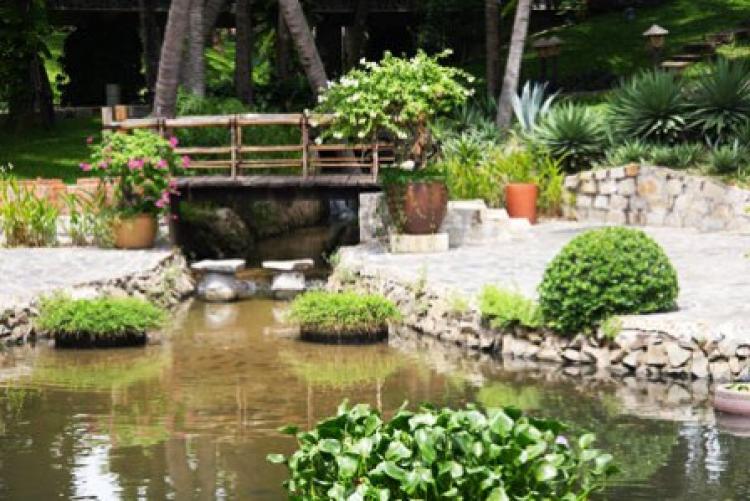 Deluxe Garden Bungalow (45 кв.м) — с видом на фонтан и сад, состоит из спальни с гостиной зоной, ванной комнаты с ванной и окном и большой террасы.