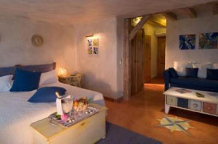 Suite Stella - двухкомнатный номер с видом на море, площадью 40 кв.м, расположенный на первом этаже отеля. Огромная кровать с пологом из дуба, полированные цементные полы, белые тона и необработанные материалы создают почти монастырскую атмосферу, которая контрастирует с меняющимися отблесками солнца, отражающегося в море.