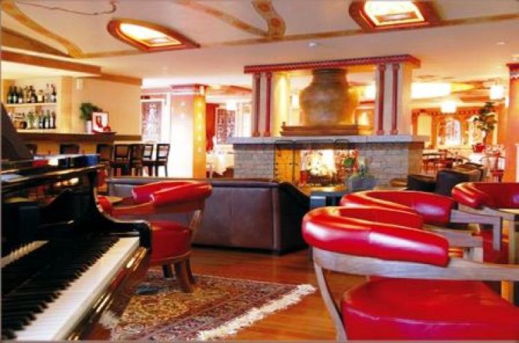 Шикарный бар, оформленный в насыщенных красных оттенках, с массивным камином в центре зала — прекрасное место для отдыха, где вечером звучит живая фортепианная музыка;
