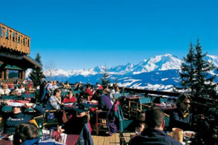 Высокогорный ресторан Face au Mont Blanc, с солнечной террасы которого открываются завораживающие виды на горы, расположен возле бассейна и доступен в летнее время года;