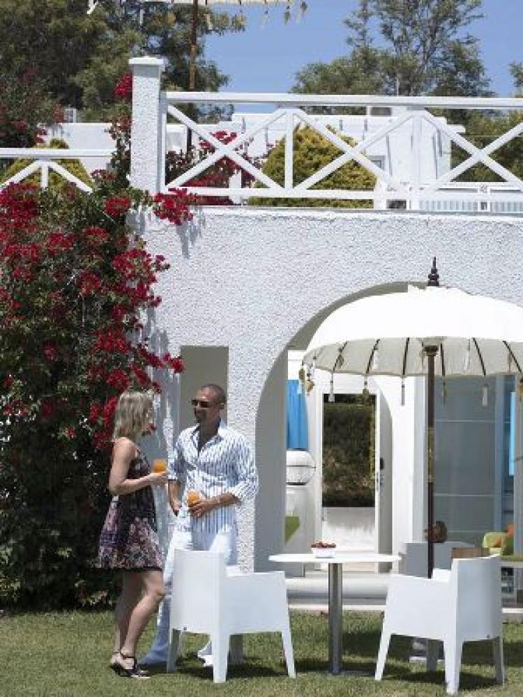 Отель, представляющий собой небольшой зелёный оазис, размещён непосредственно на замечательном широком пляже с белым песком, пологим входом в море и искрящейся бирюзовой водой. "Golden Beach" (Золотой пляж) награждён голубым флагом ЮНЕСКО и имеет репутацию одного из самых красивых и уединённых заливов острова.