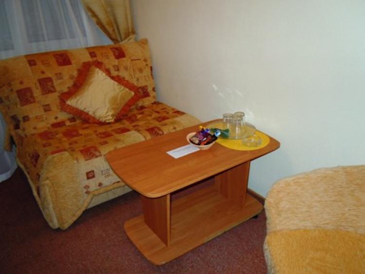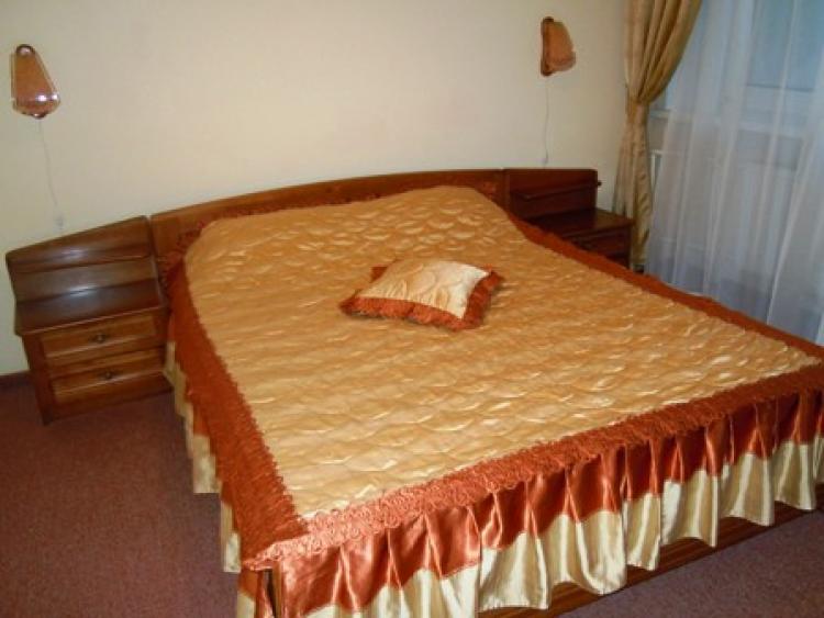 Двухкомнатный "люкс (10 номеров в основном корпусе № 2). Для проживания 2-4 человек. В номере: проходной холл (около 8 кв.м) и спальная комната (15 кв.м). В холле небольшой раскладной диван, журнальный стол, тумба с телевизором, 2 удобных кресла, банкетка, шкаф, мини-бар, телефон, балкон. В спальне: большая двухспальная кровать, прикроватные тумбочки со светильникам, туалетный столик с зеркалом. При входе в номер вешалка для одежды, полка для багажа и обуви. На полу ковровое покрытие. В ванной комнате – душ, туалетные принадлежности, фен, тапочки.