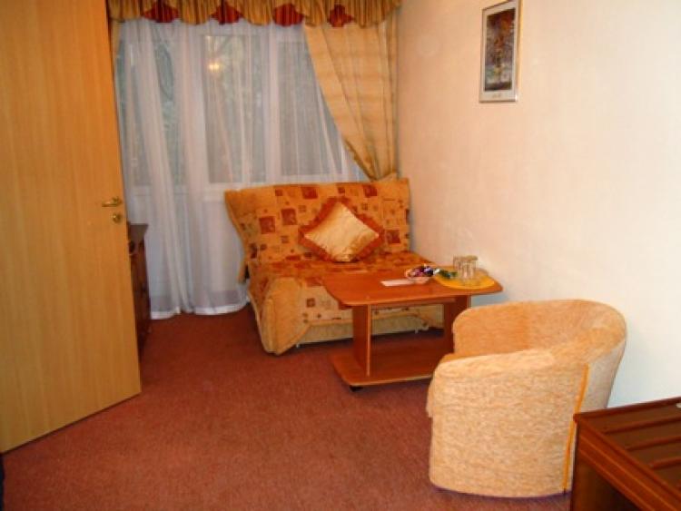 Сьют (10 номеров в основном корпусе № 2, 13 номеров в корпусах № 3, 4, 5). Для проживания 2-4 человек. Жилая площадь около 22 кв.м. В номере: одна просторная комната со спальным гарнитуром, в который входит большая двуспальная кровать, прикроватные тумбочки со светильникам, стол, туалетный столик, раскладной диванчик, 2 удобных кресла, журнальный столик телевизор, мини-бар, телефон, балкон (кроме 3 корпуса), шкаф. На полу - ковровое покрытие. При входе в номер – вешалка для одежды, полка для багажа и обуви. В ванной комнате – душ, фен, туалетные принадлежности, тапочки.