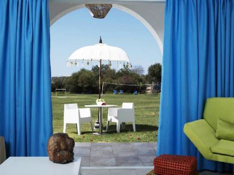Отель, представляющий собой небольшой зелёный оазис, размещён непосредственно на замечательном широком пляже с белым песком, пологим входом в море и искрящейся бирюзовой водой. "Golden Beach" (Золотой пляж) награждён голубым флагом ЮНЕСКО и имеет репутацию одного из самых красивых и уединённых заливов острова.